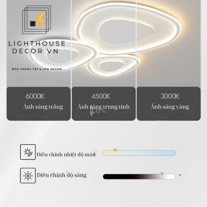 Sản phẩm được tích hợp chế độ ánh sáng 3 màu gồm: ánh sáng trắng (6000K), ánh sáng trung tính (4500K) và ánh sáng vàng (3000K). Nhờ đó, đèn ốp trần LED phòng khách hiện đại hình đá cuội WOPT8278 dễ dàng điều chỉnh để phù hợp với từng thời điểm trong ngày: sáng rõ cho sinh hoạt, trung tính cho tiếp khách và ánh sáng vàng ấm cho thư giãn buổi tối.