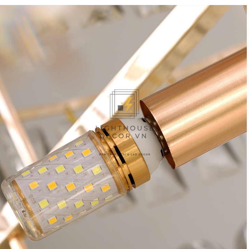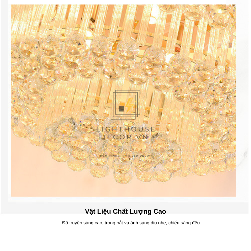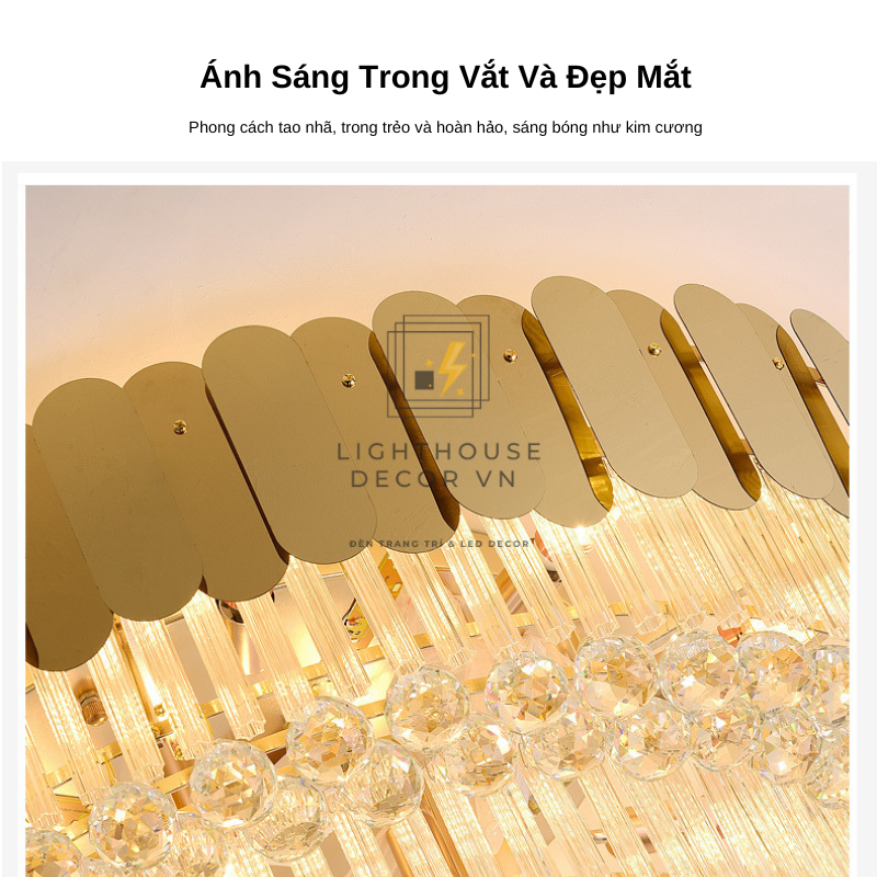 Mỗi lớp pha lê được cắt vát tỉ mỉ bằng công nghệ CNC, giúp từng viên phản chiếu ánh sáng rực rỡ như viên kim cương trong suốt.